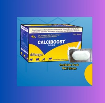 Calciboost Bolus is a comprehensive calcium and mineral supplement formulated to support lactating dairy animals and improve overall productivity. Enriched with calcium, phosphorus, vitamins A, D₃, E, B₁₂, biotin, and herbal ingredients like Jivanti and Shatavari, it helps shorten milk letdown intervals and enhance milk yield. Added Zinc and Copper MHA strengthen udder immunity and protect against mastitis. Calciboost is also effective as supportive therapy in retained placenta and poor lactation conditions, making it ideal for maintaining udder health and ensuring sustained animal performance.