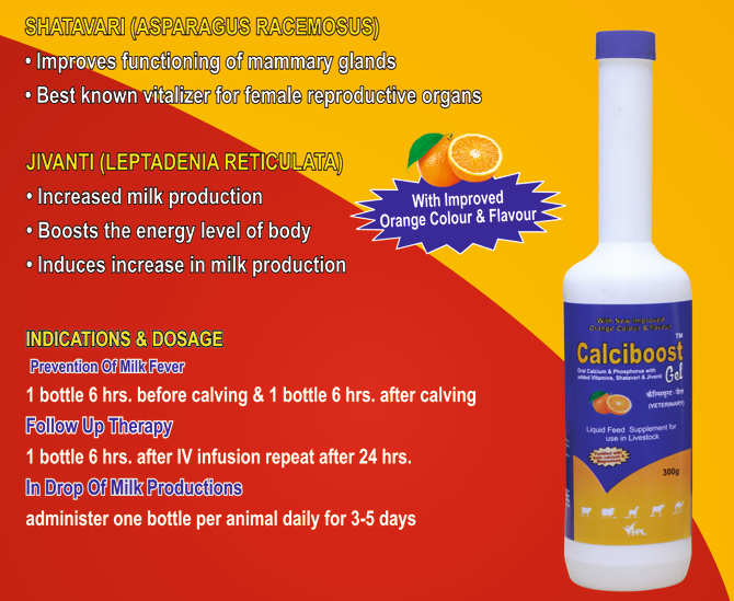 Calciboost Gel is an advanced oral calcium supplement enriched with Ionic Calcium, Magnesium, Vitamin D3, Vitamin B12, Shatavari, and Jivanti to support dairy animals during calving, peak lactation, and stress periods. It helps prevent milk fever, boosts milk yield, supports faster recovery, improves udder development, and enhances overall energy levels. Ideal for pre- and post-calving use and improving reproductive and lactation performance.