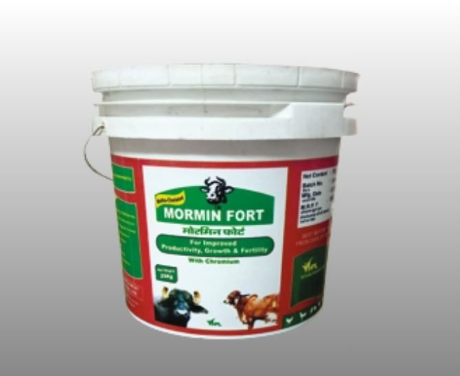 Mormin Fort is a metho-chelated mineral and vitamin supplement designed to boost fertility, improve milk production, enhance growth, and strengthen immunity in dairy animals. Enriched with essential minerals, vitamins, probiotics, and amino acids, it supports better digestion, faster weight gain, stronger legs, and the overall healthy development of calves and adult animals.