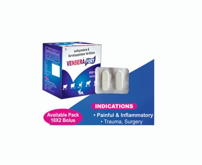 Vensera Fort is a veterinary bolus combining Isoflupredone and Serratiopeptidase for effective management of painful and inflammatory conditions in animals. Isoflupredone, a potent corticosteroid, helps reduce inflammation and allergic reactions and is safe for lactating and pregnant animals. Serratiopeptidase enhances tissue penetration by breaking down inflammatory proteins, improving the effectiveness of antibiotics and NSAIDs. Vensera Fort is indicated in trauma, surgery, udder swelling, mastitis, pneumonia, metritis, allergic disorders, and anaphylactic reactions, offering fast relief and improved recovery under veterinary guidance.